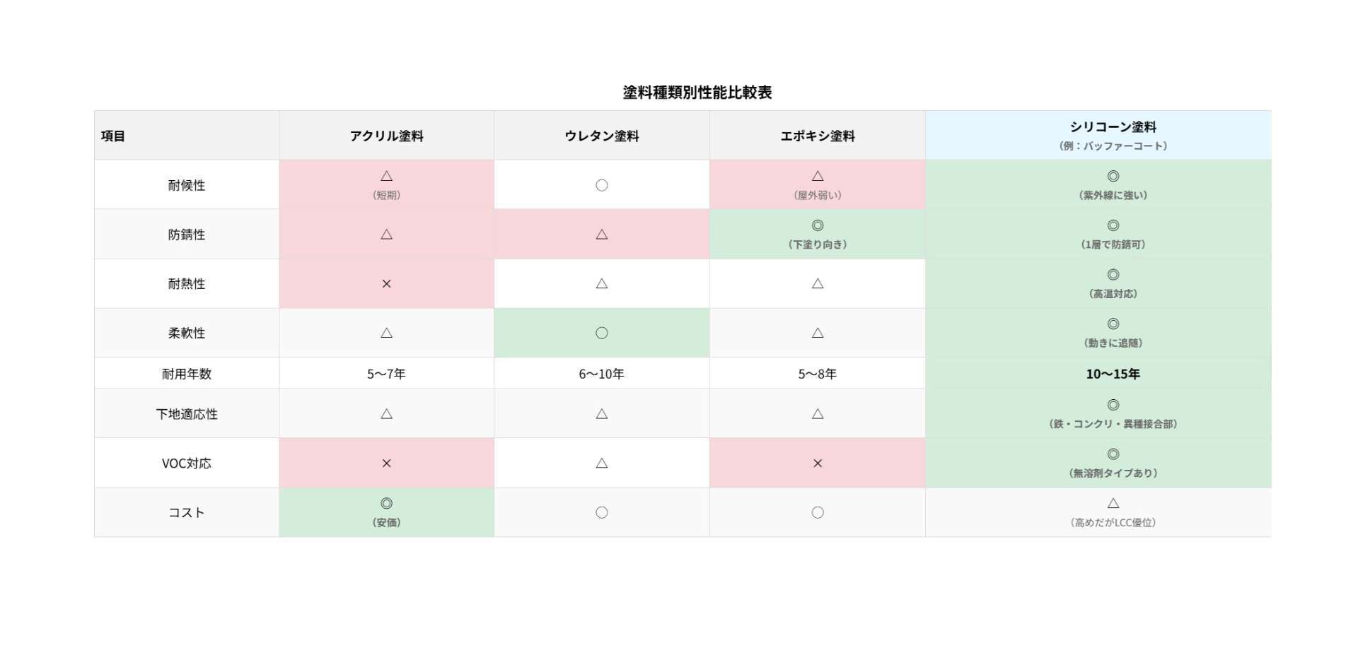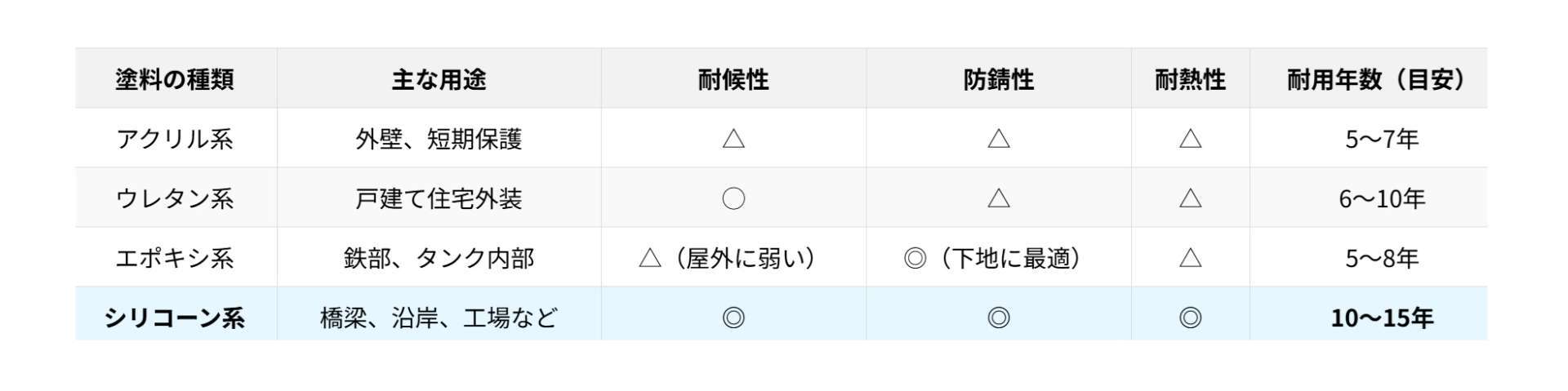 防錆塗料にはさまざまな種類がありますが、それぞれ特性や用途が異なります。以下は主な塗料種別との比較表です。