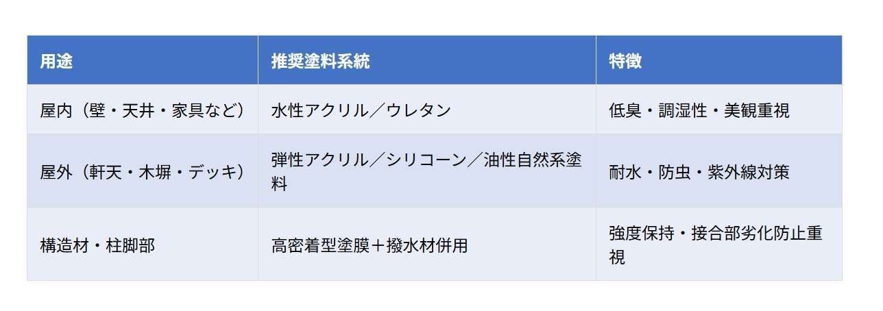 木部の塗料選びは、「どこに・どの程度の環境で使われるか」によって適するタイプが異なります。