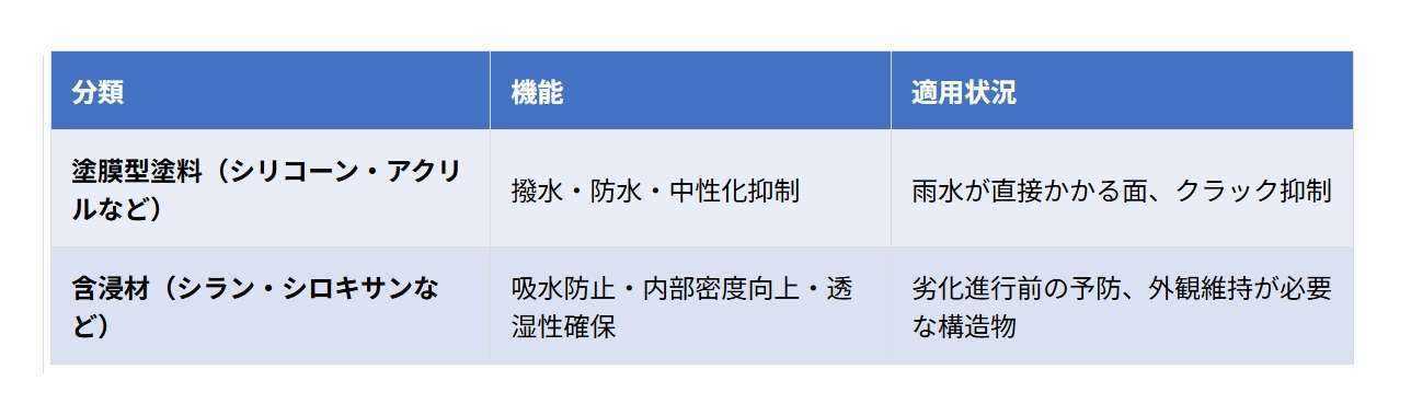 ✅ 「劣化進行度」「景観保持」「湿気環境」などを総合判断し、塗料と含浸材を併用または使い分けすることが推奨されます。