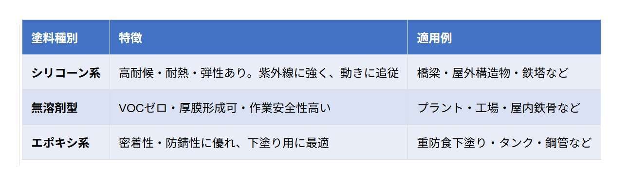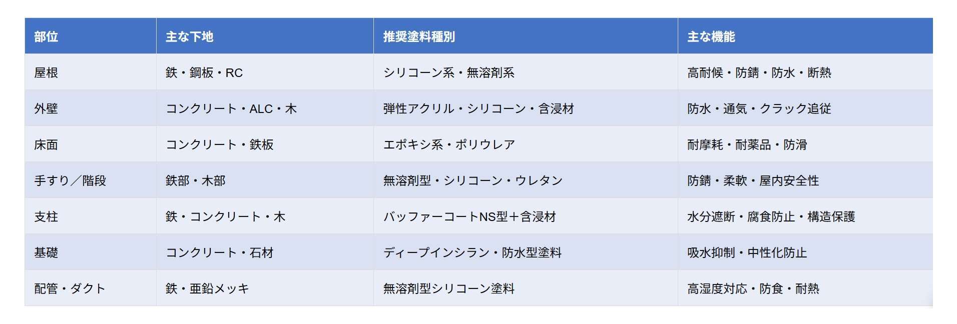 以下に、構造物の部位ごとに最適な塗料種別を整理した早見表を示します。実際の現場環境や仕様条件に応じてカスタマイズしてください。