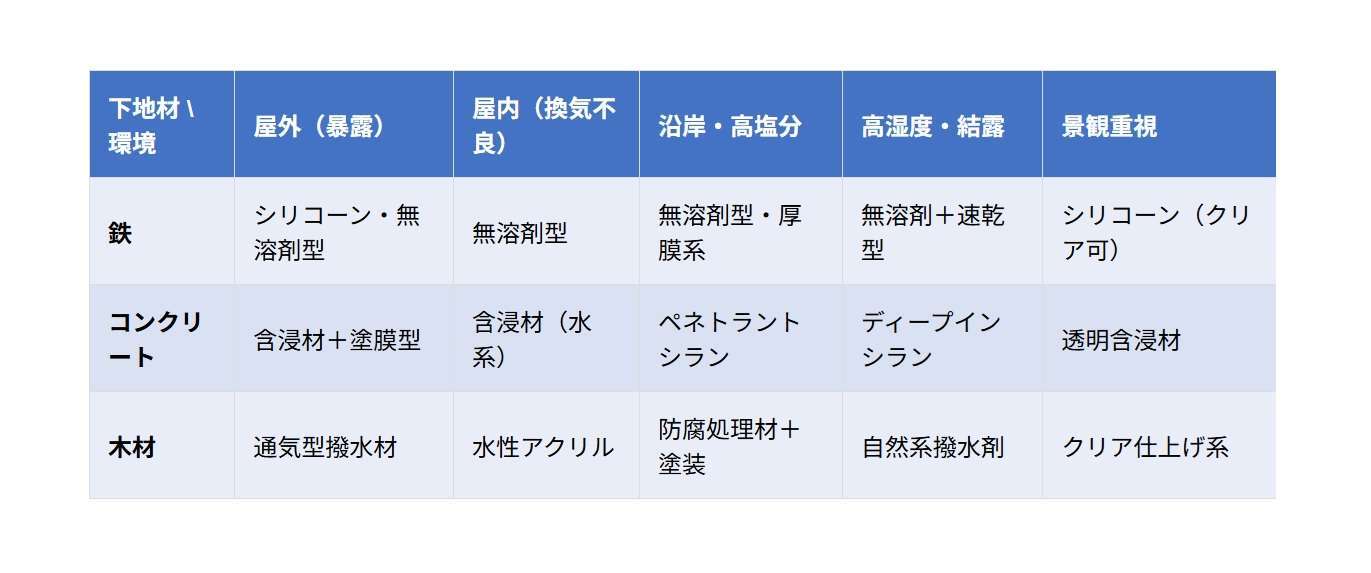 -下地材 × 環境条件 × 推奨塗料(表で整理)